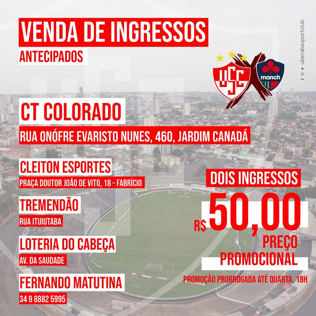 Esperando contar com o apoio da sua torcida, a diretoria do Uberaba SC resolveu fazer uma promoção nos ingressos: dois por R$ 50. O intuito é levar muitos torcedores para empurrar o time, na partida que pode ser chamada da “vida”, pois até mesmo com um empate o Colorado chega ao acesso do módulo II.