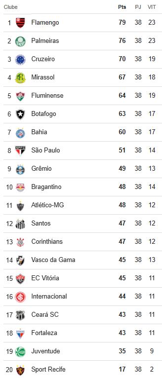 A jornada derradeira confirmou ainda as últimas vagas para a Copa Libertadores e para a Copa Sul-Americana, além de definir os quatro clubes que deixaram a elite. Ceará e Fortaleza, rivais históricos do Nordeste, tiveram a queda confirmada no domingo, enquanto Juventude e Sport completaram a lista dos rebaixados.