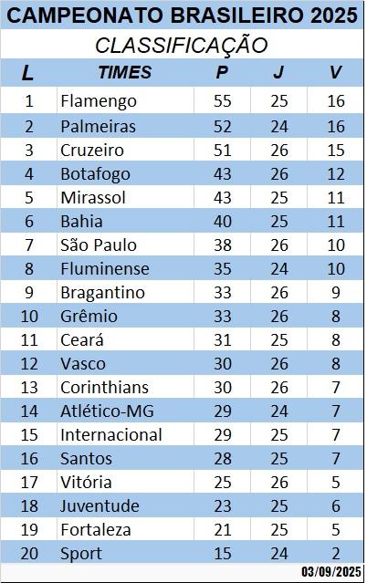 Alternando entre empates e vitórias, o Flamengo desperdiçou a chance de se isolar ainda mais na liderança da competição, ainda mais em um confronto direto, chegando a 55 pontos e com um jogo a menos a ser disputado. Mesma situação do Cruzeiro, que não vence há duas partidas e perdeu a chance de seguir na vice-liderança e colar no rival, ocupando a terceira colocação, com 51 pontos. Óbvio, quem agradece pelo resultado foi o Palmeiras, que é o segundo colocado com 52 e tem dois jogos a menos a cumprir.