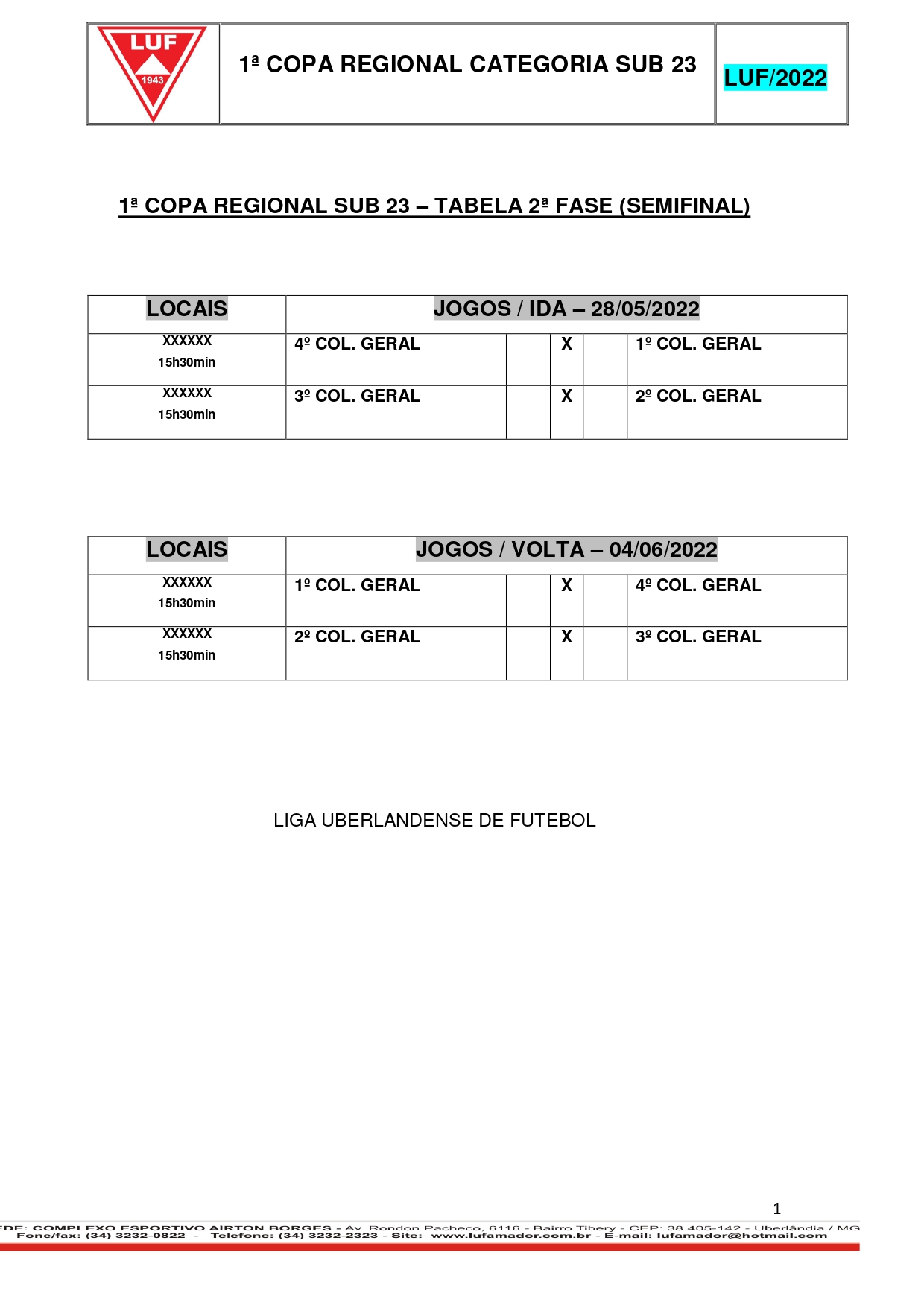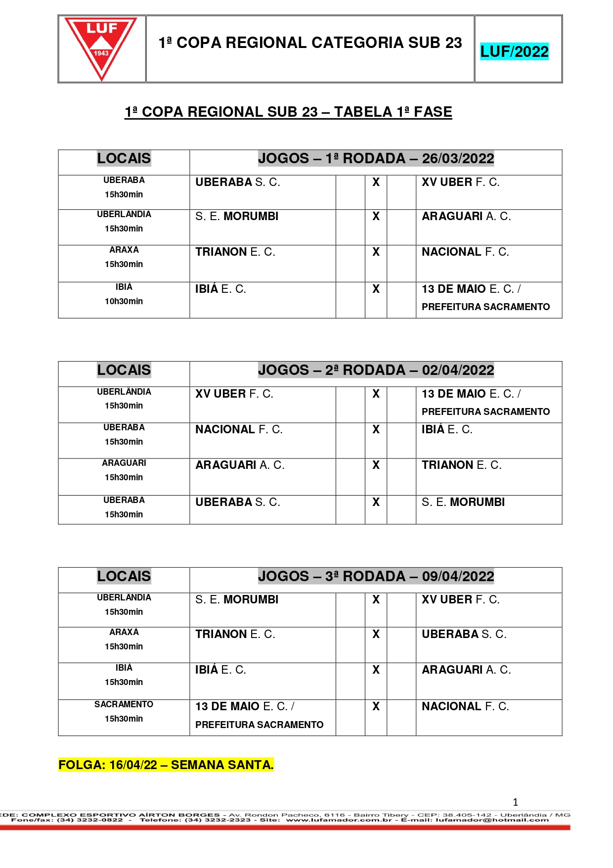 Tabela mostra que na primeira rodada, o Uberaba SC joga em casa contra o XV de Uberlândia, partida marcada para sábado (26) às 15h30.