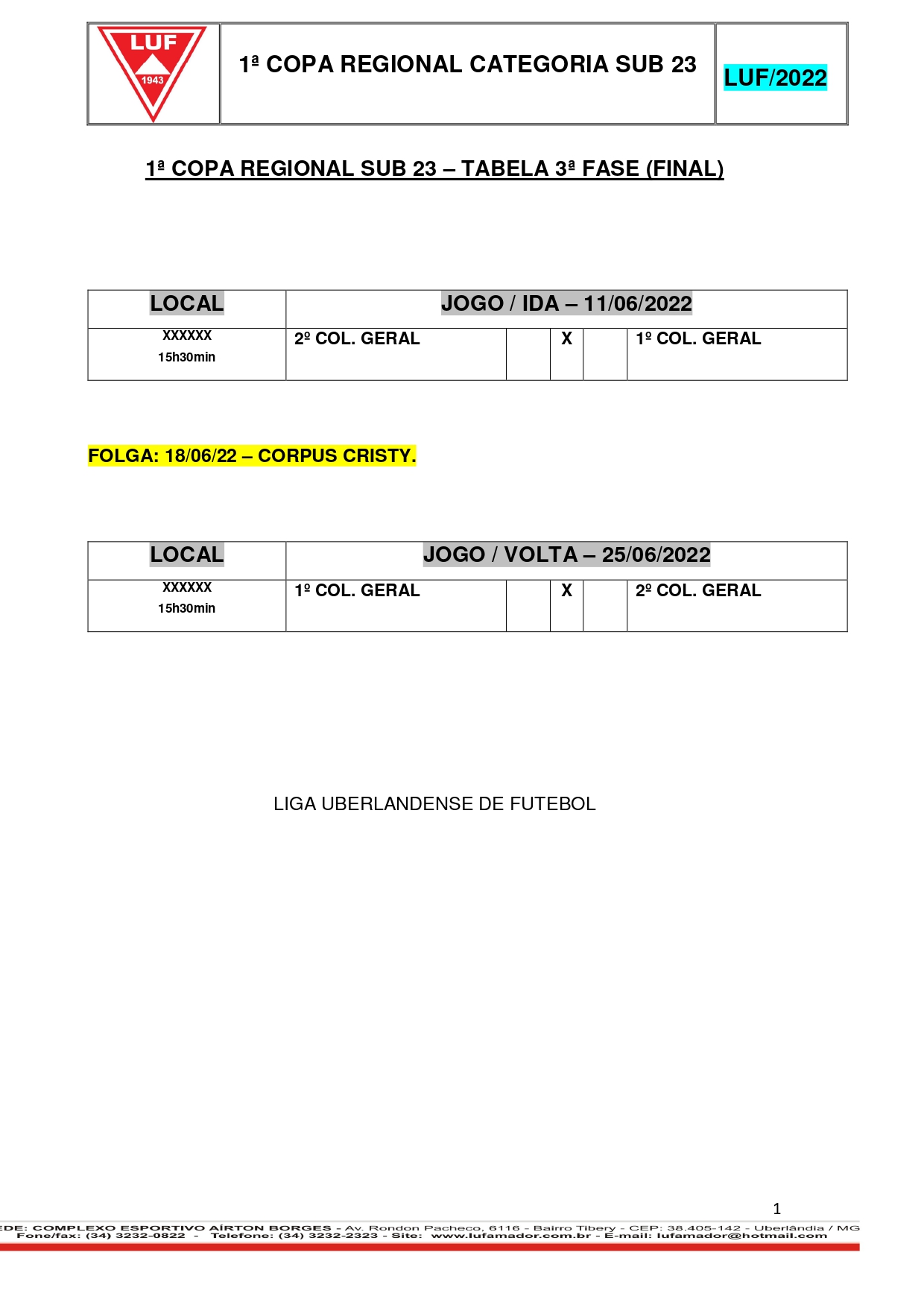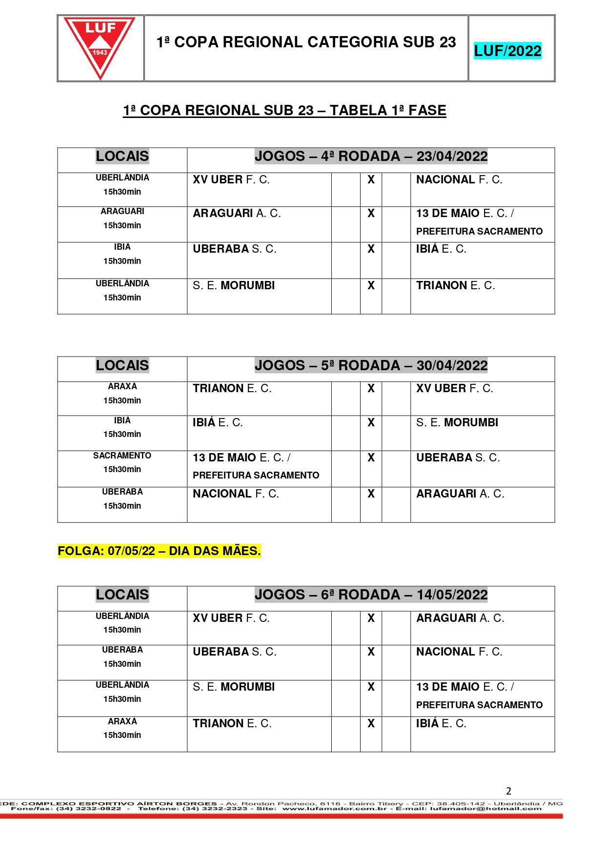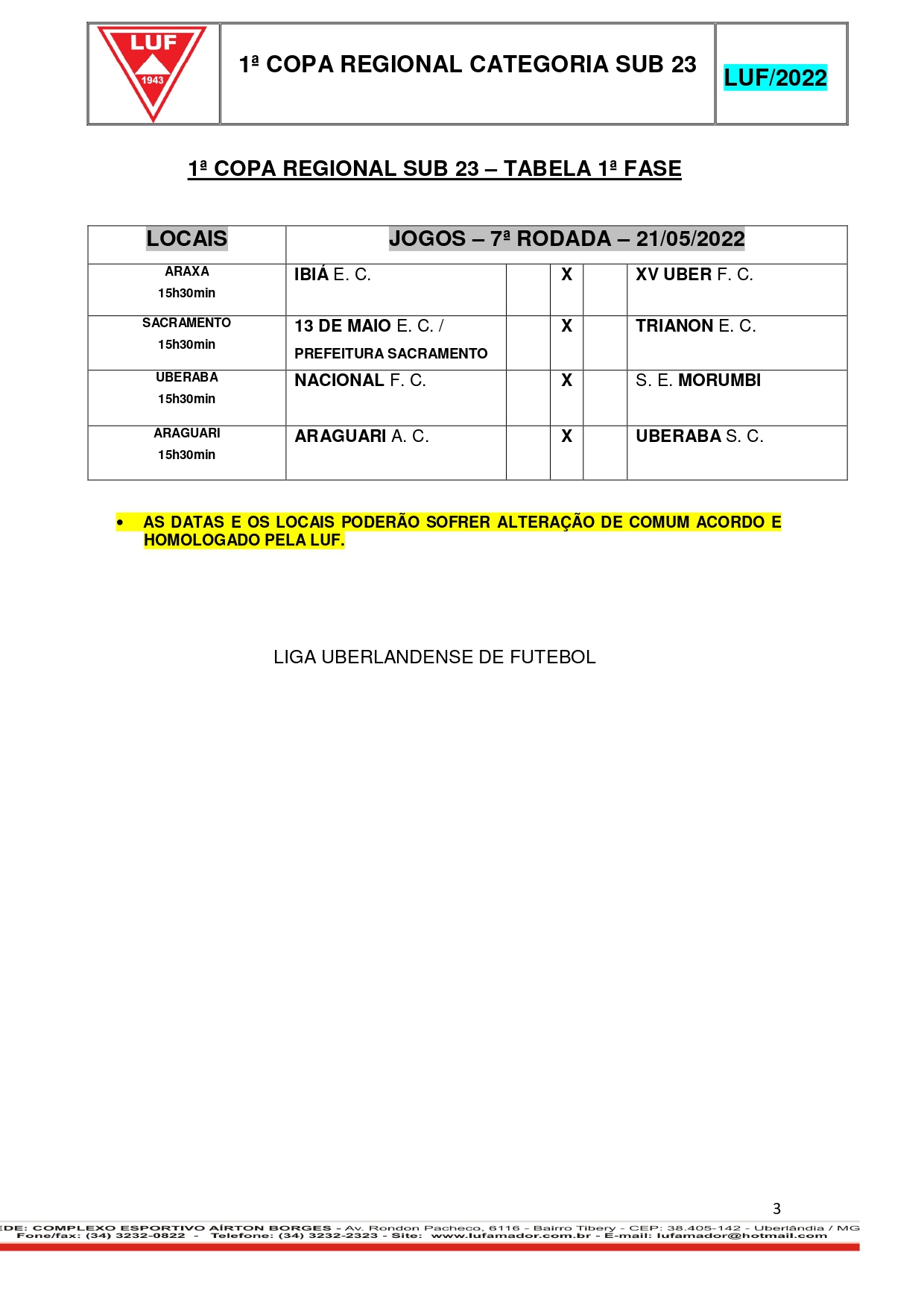 Já o Nacional vai até Araxá enfrentar o Trianon, jogo que começa às 15h30. Os demais jogos sã SE Morumbi x Araguari, também jogam às 15h30. Em Ibiá a partida começa às 10h30 com Ibiá x 13 de Maio.
