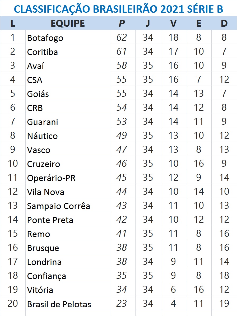 O Cruzeiro praticamente está livre de um possível rebaixamento para a Série C. Não é uma certeza matemática, porque com 46 pontos, em décimo lugar, ainda pode ser alcançado por Londrina ou Brusque (16º), ambos com 38 pontos. Mas as chances disso acontecer são mínimas nas últimas três rodadas. São oito pontos de diferença.