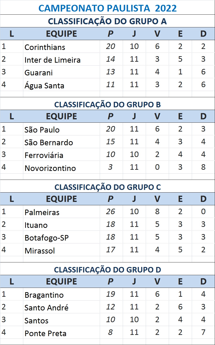 Já classificado para as quartas de final, o Palmeiras soma 26 pontos, na liderança do Grupo C. O Santos é o terceiro colocado da chave D, com 10 pontos, atrás de Red Bull Bragantino (20) e Santo André (12).