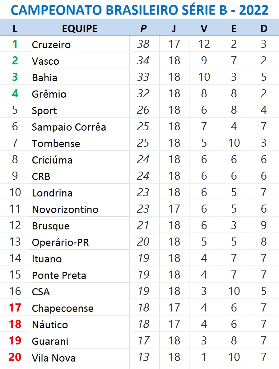 O Bahia segurou a terceira posição na tabela do Campeonato Brasileiro da Série B, ao vencer o Guarani, por 2 a 0, no início da noite de sábado no estádio Brinco de Ouro da Princesa, em Campinas, pela 18ª rodada. Invicto há quatro jogos, o tricolor baiano soma 33 pontos, um na frente do Grêmio (32) em quarto lugar, e um atrás do Vasco, vice-líder com 34 pontos. O Cruzeiro lidera com folga, com 38 pontos. O novo tropeço deixou o Guarani com 17 pontos, na penúltima posição, ficando na frente somente do Vila Nova-GO, com 13 pontos.