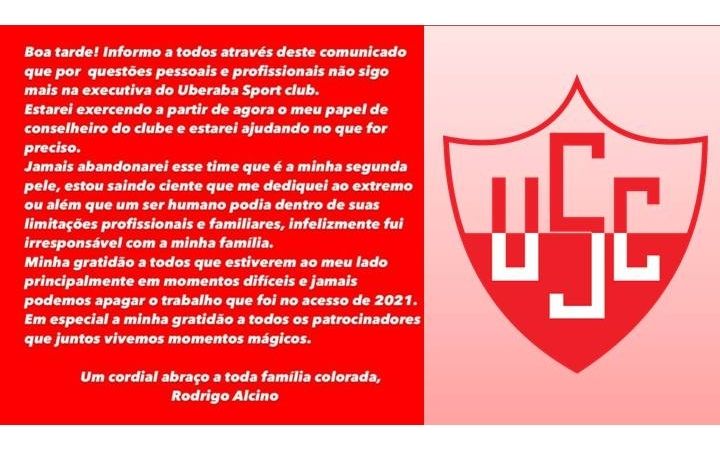 Em um breve recado publicado na Internet, o presidente do Uberaba Sport publicou que não responde mais pela diretoria executiva do clube. Rodrigo Alcino agradeceu a todas as pessoas que estiveram ao seu lado enquanto presidente do Colorado; “Minha gratidão a todos que estiveram ao meu lado, principalmente nos momentos mais difíceis”, disse Rodrigo Alcino.