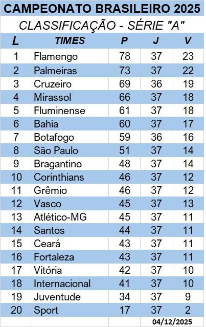 O cenário do lado gaúcho, porém, é alarmante. O Internacional estacionou nos 41 pontos, caiu para o 18º lugar e agora depende de uma combinação complexa para evitar a queda. A equipe de Abel Braga chegou ao terceiro jogo consecutivo sem vencer e ficou dois pontos atrás do Fortaleza, primeira equipe fora do Z4, restando apenas três em disputa.
