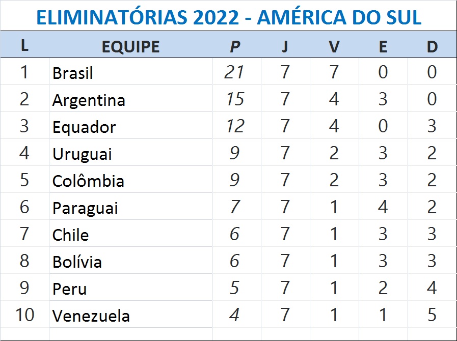 O resultado mantém o time de Tite com folga na liderança da tabela. Agora, tem 21 pontos, seis a mais do que a Argentina, a segunda colocada. No domingo, às 16h, o Brasil encara a Argentina na Neo Química Arena.