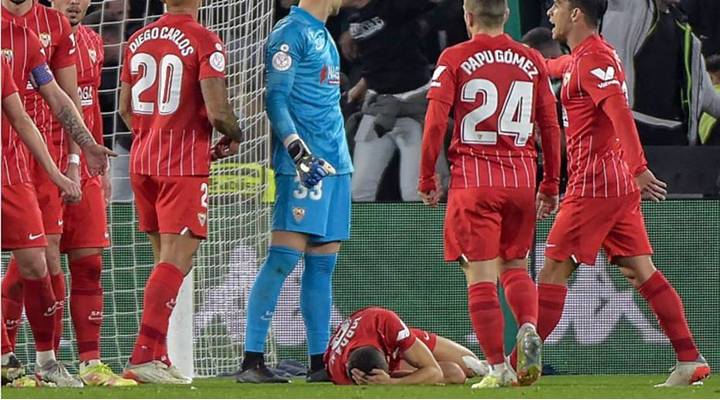 Logo após as comemorações do gol olímpico de empate do Betis, um torcedor arremessou uma barra de plástico em direção ao campo e atingiu a cabeça de Joan Jordán, meio-campista do Sevilla.