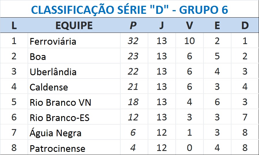 Mais dois times mineiros se classificaram pelo mesmo grupo, graças ao triunfo do Boa Esporte. O Uberlândia derrotou o Rio Branco-ES, por 2 a 0, em Cariacica, e subiu para o terceiro lugar, com 22 pontos. A Caldense perdeu para a Ferroviária, líder, por 3 a 1, em Araraquara, caiu para a quarta posição, mas também está garantida na etapa seguinte da Série D.