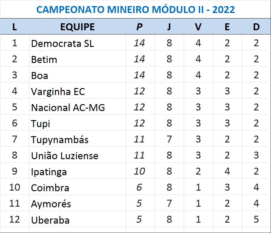 UNIÃO LUZIENSE: Edson; Júlio Cesar, Samuel (Paulo Roberto), Breno e Yuri; Felipe (Renato), Izais, Diego (Laercio); Thiaguinho (Luiz Fernando), Pedro Gabriel e Maicon (Luiz Felipe). Tec. Marcelo Oliveira.