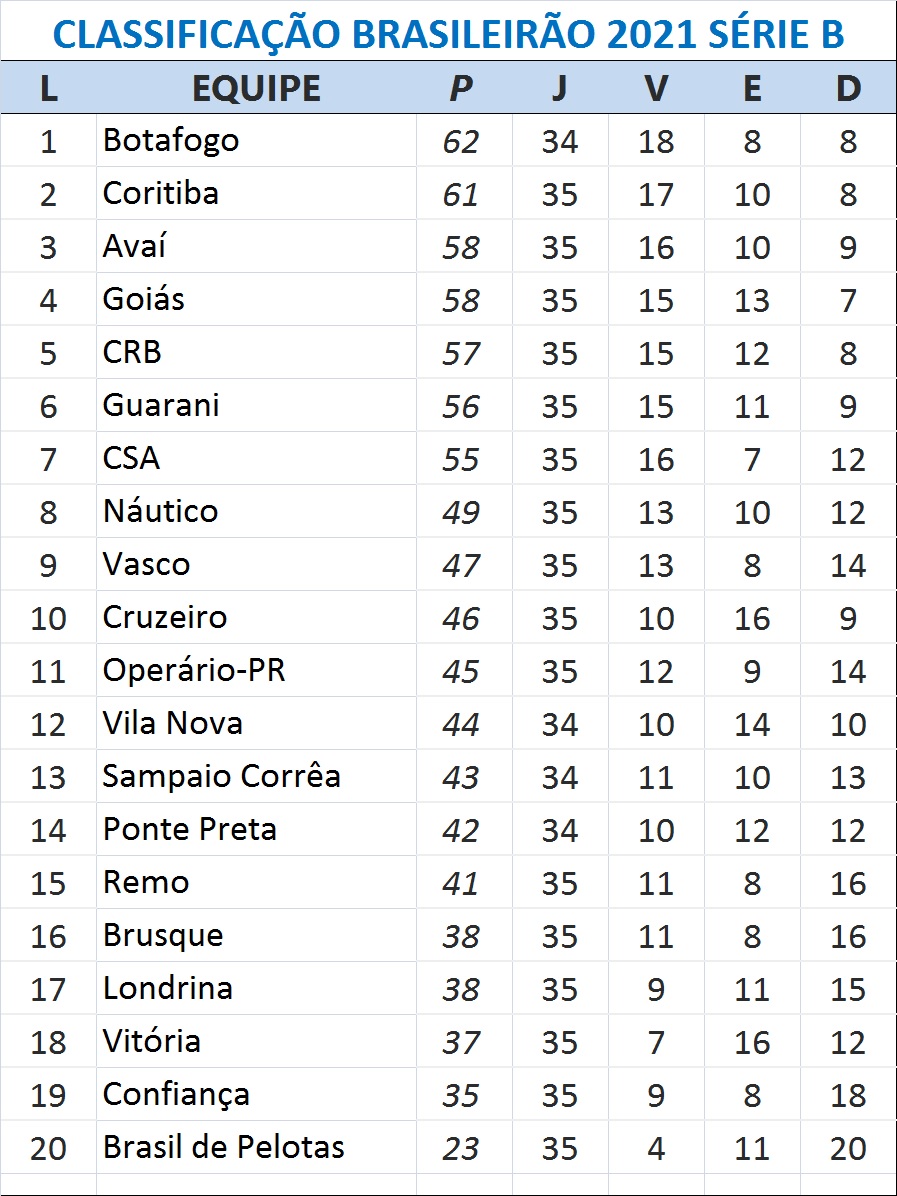 Já o Vitória segue vivo na briga pela permanência na Série B. O resultado positivo deixou o time em 18º, com 37 pontos, apenas um ponto atrás do Londrina (17º, com 38) e Brusque (16º, também com 38).