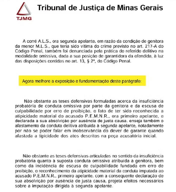 Confirmado por O TEMPO, a decisão mostra o parágrafo original e, logo abaixo, a versão reescrita pela ferramenta tecnológica. "Agora melhore a exposição e fundamentação deste parágrafo", dizia o comando deixado na página 45 do acórdão.