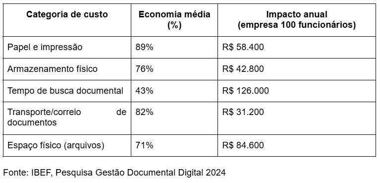 No contexto brasileiro, os números são igualmente expressivos. Levantamento do Instituto Brasileiro de Executivos de Finanças (IBEF) de 2024 com 240 empresas de médio porte revelou economia média de R$ 14.200 anuais por colaborador após implementação completa de gestão documental digital. Os principais componentes dessa economia incluem redução de 89% em custos com papel e impressão, eliminação de 76% dos gastos com armazenamento físico e diminuição de 43% no tempo de busca por documentos.