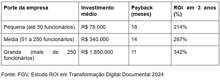 Aplicando essa metodologia a 180 empresas latino-americanas, a pesquisa identificou ROI médio de 287% em três anos para investimentos em digitalização documental completa. No Brasil, dados da FGV de 2024 com 95 empresas que completaram processos de digitalização documental mostram payback médio de 14 meses, considerando custos de software, hardware, capacitação e consultoria.