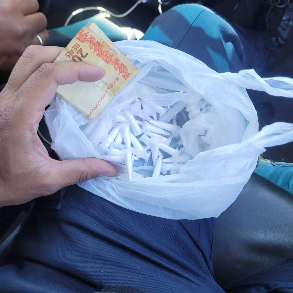Um dos suspeitos, menor de idade, arremessou uma sacola plástica no meio-fio, que continha 78 pinos de substância análoga à cocaína. No bolso do adolescente, os guardas encontraram R$ 65,00.