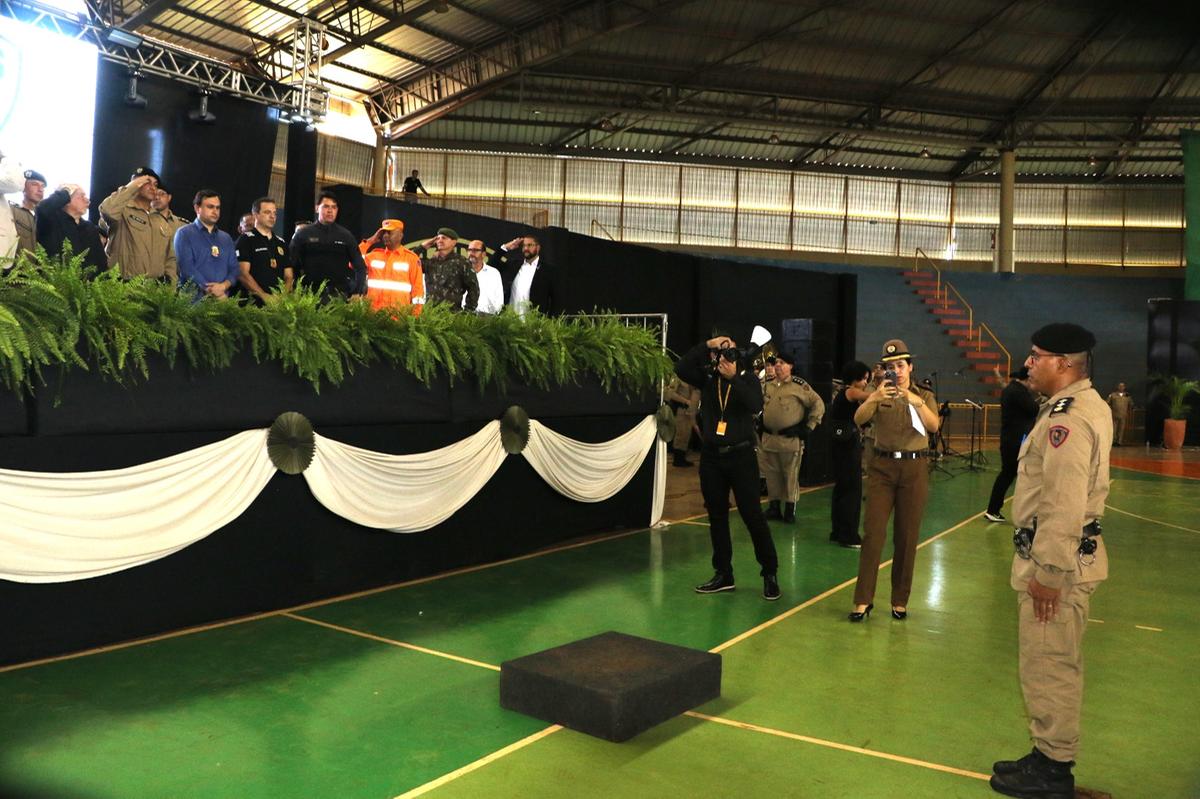 A 5ª Região de Polícia Militar (RPM) realizou, na manhã desta sexta-feira (7), a solenidade de entrega de boinas e apresentação da Bandeira Nacional e do Estandarte Histórico da Polícia Militar de Minas Gerais (PMMG) aos integrantes do Curso de Formação de Soldados 2024. O evento ocorreu no Ginásio Wagner do Nascimento, em Uberaba.