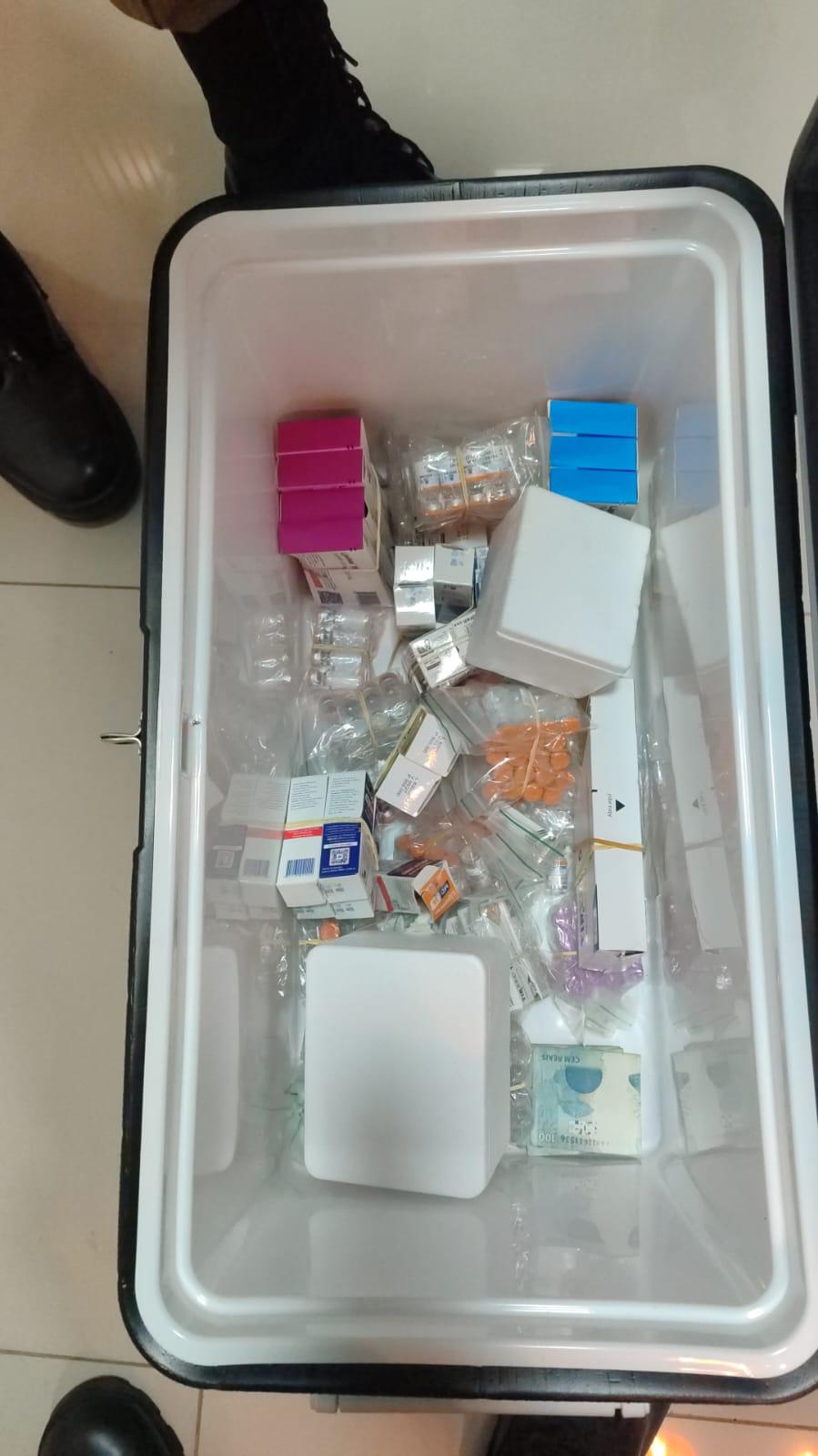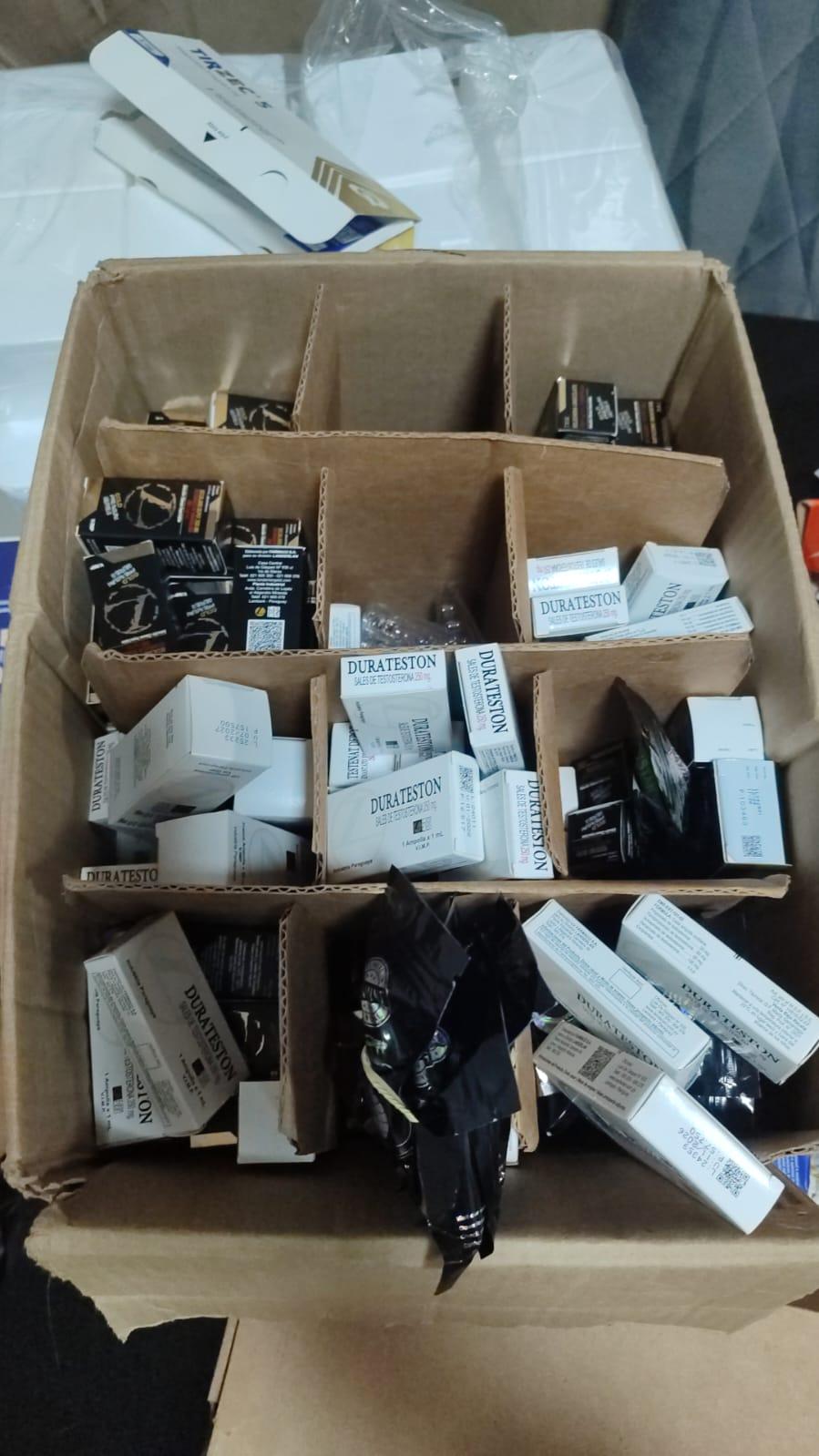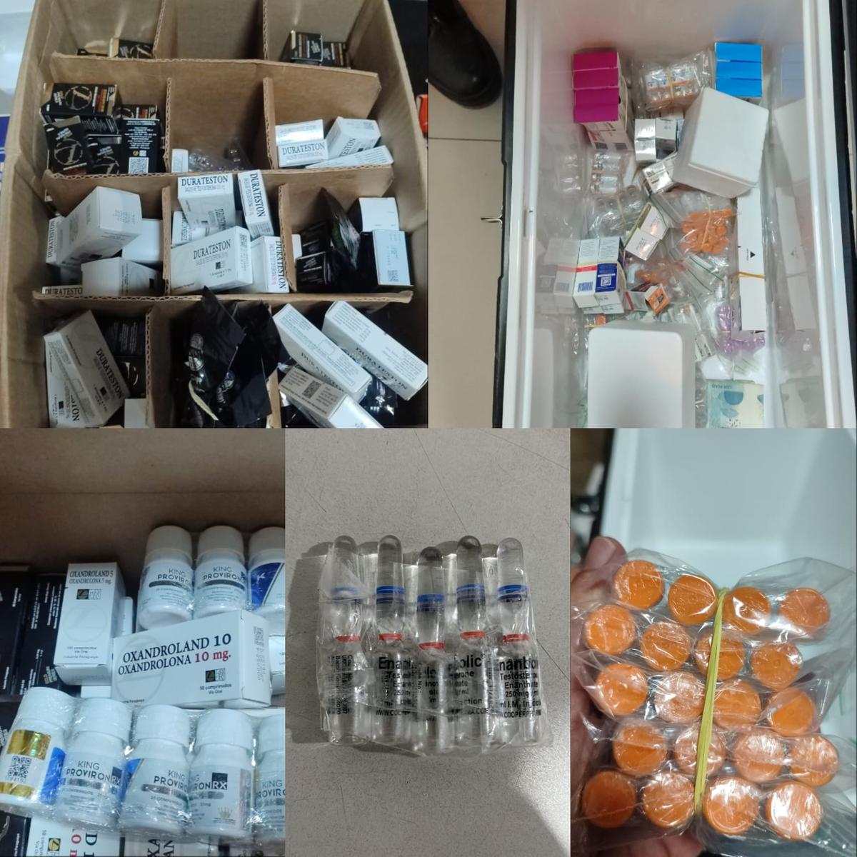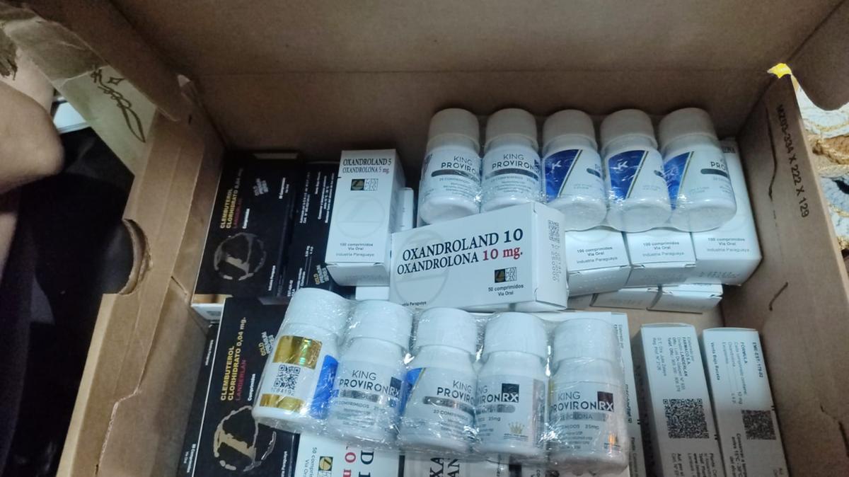 No local, foram encontradas grandes quantidades de mercadorias estrangeiras, incluindo 158 unidades de anabolizantes e hormônios, 83 produtos para emagrecimento, além de ampolas, comprimidos e outros insumos, caracterizando os crimes de contrabando e descaminho.