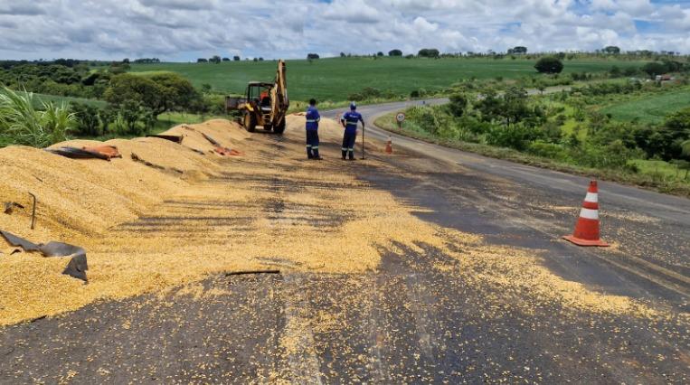Acidente aconteceu próximo ao distrito de Tapuirama, em decorrência de curva sinuosa e asfalto molhado; carga de milho se espalhou e via precisou ser limpa pela concessionária