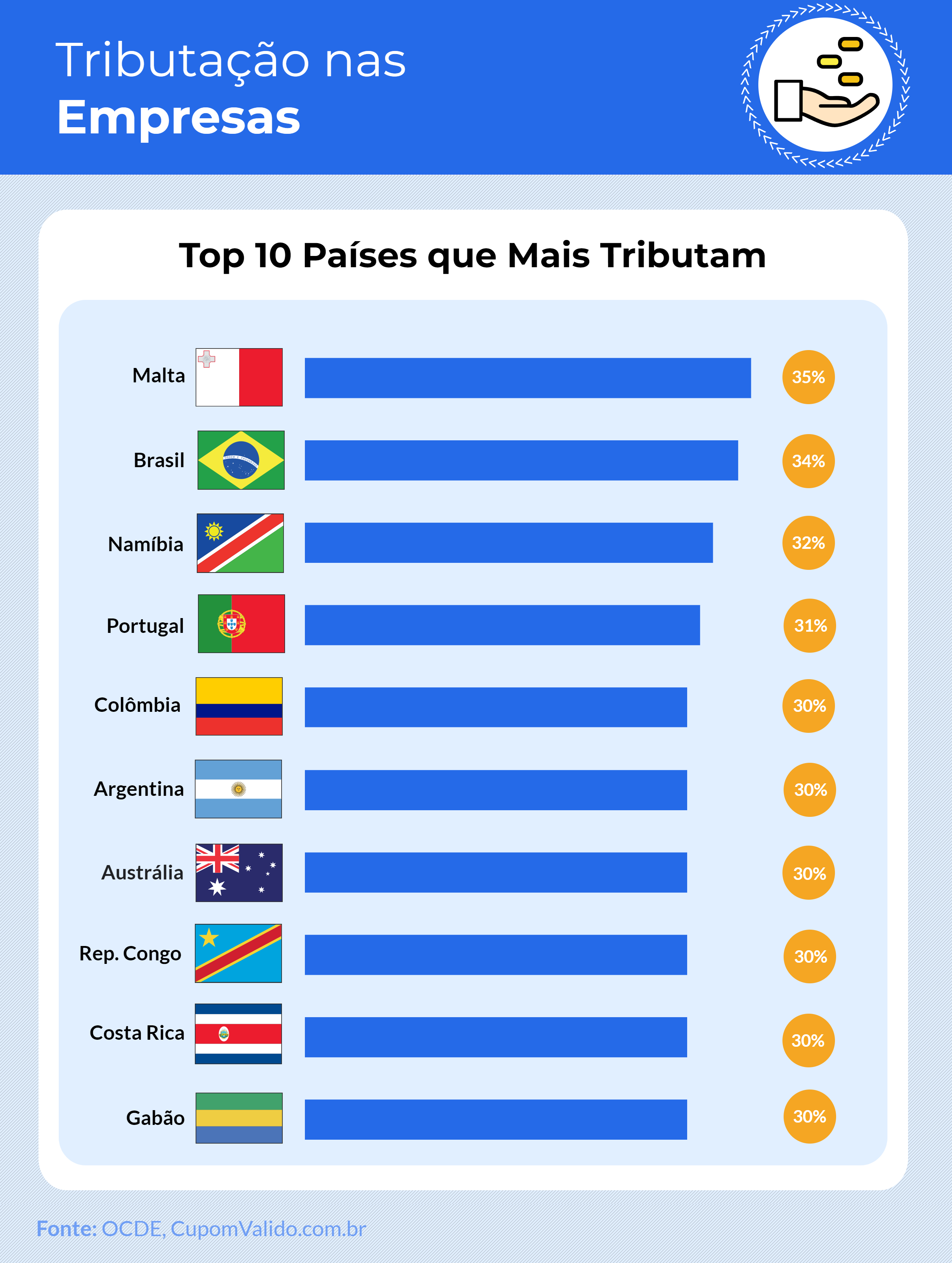 Ao considerar todos os impostos, as empresas brasileiras pagam na média uma alíquota de imposto de 34%. Este valor é 70% maior que a média mundial, e somente 1% menor que Malta - que está no topo do ranking com 35%.