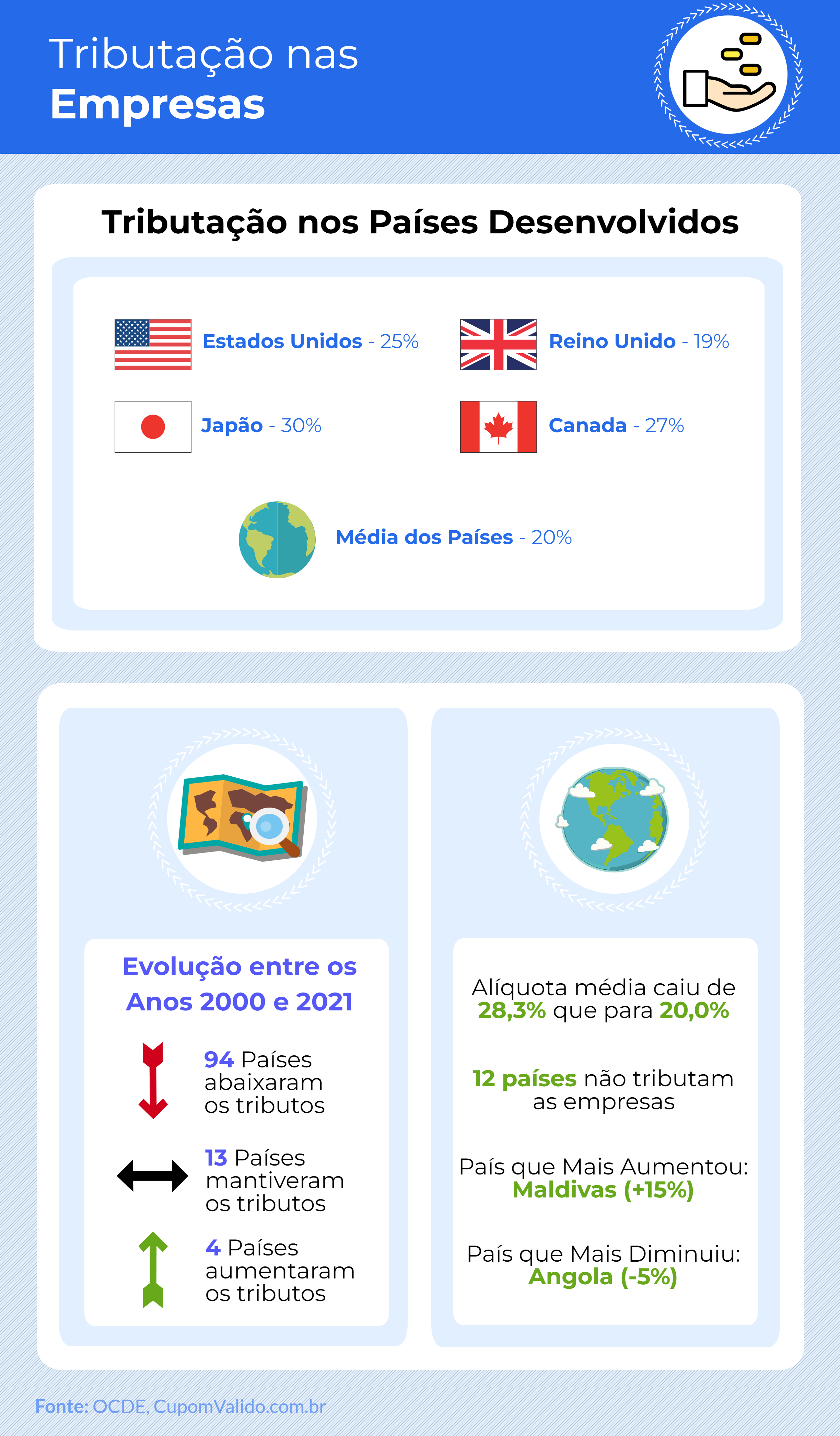 Ao comparar a tributação sobre as empresas de 2000 até 2021, a grande maioria dos países diminuíram a alíquota de tributos sobre as empresas. Na média, o valor da alíquota caiu 8,3% - saindo de 28,3% em 2000 para 20,0% em 2021.