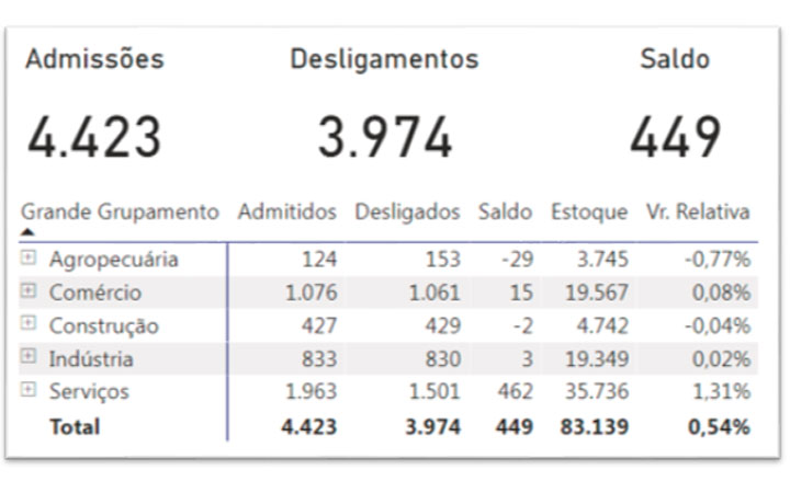 O melhor desempenho foi registrado no setor de serviços, com 1.963 contratações e 1.501 desligamentos, o que gerou um saldo positivo de 462 novos postos de trabalho.