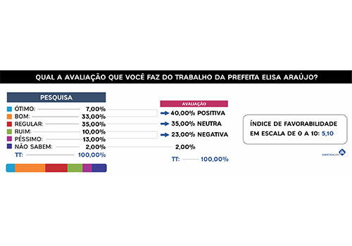Pesquisa do Instituto Didáticacom aponta 40% de avaliação positiva (ótimo ou bom) do primeiro ano do governo Elisa Araújo (Solidariedade). Outros 35% consideraram a gestão regular e as respostas negativas (ruim ou péssimo) somaram 23%. O levantamento foi realizado nos dias 11 e 12 de dezembro, com 500 entrevistas presenciais. A margem de erro é de 4,5% para cima ou para baixo.