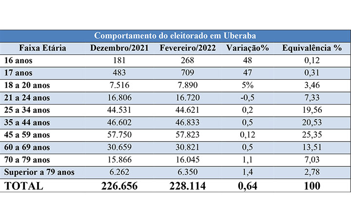 A sete meses da eleição, o número de eleitores em Uberaba cresceu quase 0,7%. A cidade tinha 226.656 pessoas registradas para votarem em dezembro de 2021. O total subiu para 228.114 em fevereiro deste ano, conforme dados do sistema online da Justiça Eleitoral.