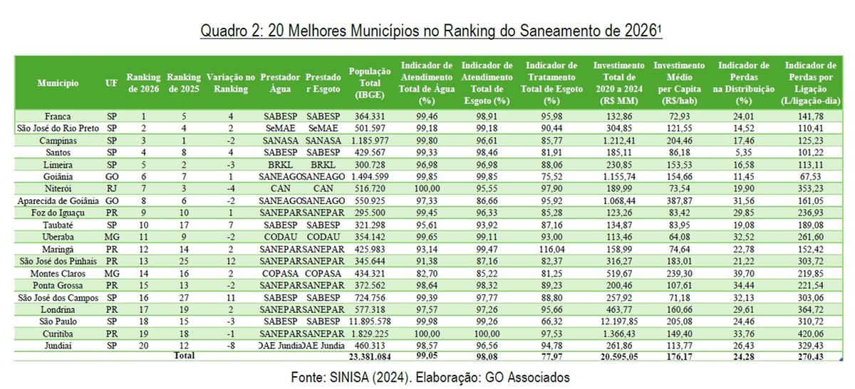 No topo do ranking estão Franca, São José do Rio Preto, Campinas e Santos, cidades que já atingiram a universalização do saneamento. Na outra ponta aparecem Santarém, Porto Velho, Rio Branco, Várzea Grande e Parauapebas, com os piores indicadores.