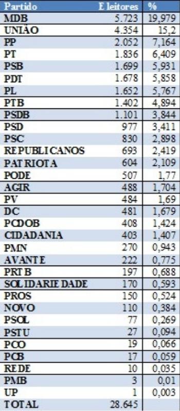 Por outro lado, o UP (Unidade Popular pelo Socialismo) surge como lanterninha e tem apenas um eleitor filiado na cidade. O PMB é o segundo menor, com apenas três pessoas cadastradas.
