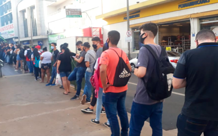 Usuários do transporte coletivo padecem com longas filas à espera de ônibus nos horários de pico em Uberaba (Foto/Leitor JM)