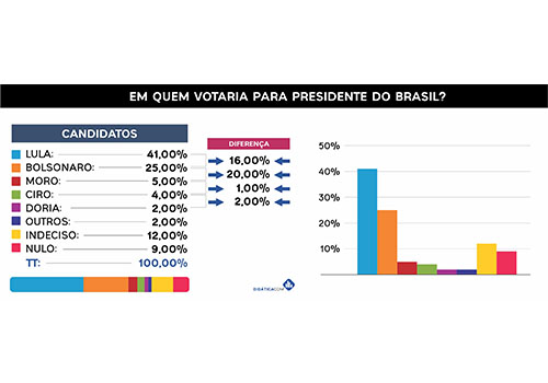 O ex-juiz Sérgio Moro (Pode) e o ex-governador do Ceará, Ciro Gomes (PDT), foram indicados, respectivamente, por 5% e 4% das pessoas ouvidas. Já o governador de São Paulo, João Dória (PSDB), teve apenas 2% das respostas. Os indecisos representaram 12% e votos nulos, 9%.