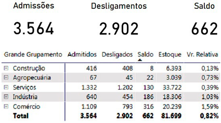 O setor da economia que mais abriu vagas foi o comércio, com 1.109 contratações e 793 baixas, perfazendo saldo positivo de 316 trabalhadores a mais. Depois aparece a indústria, com 640 admissões e 454 demissões, obtendo saldo de 186 novas vagas. Serviços vem na terceira posição, sendo o setor que mais admitiu, com 1.332 registros em carteira, mas também foi o que mais demitiu, dispensando 1.202 trabalhadores, o que contribuiu com mais 130 vagas no estoque do mercado de trabalho na cidade.