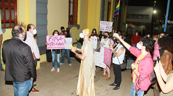 O presidente da Câmara Municipal de Uberaba, Ismar Marão (PSD), e os vereadores Rochelle Gutierrez (PP) e Tulio Micheli (PSL) atenderam no local do ato os manifestantes do Beth Pantera, coletivo de pessoas LGBTQIA+ e simpatizantes da causa que protestaram contra o Título de Cidadania concedido ao deputado federal Marco Feliciano (Republicanos).