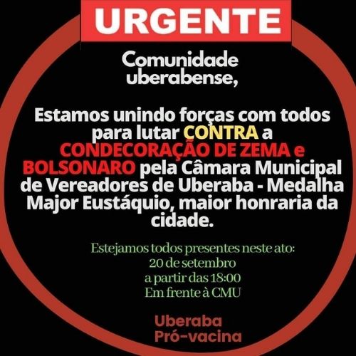 O grupo se autodenomina como Pró-Vacina e convida para manifestação nesta segunda-feira (20), às 18h, na praça Rui Barbosa, em frente a CMU. No chamado o grupo destaca que: “Estamos unindo forças com todos para a luta contra condecoração de Zema e Bolsonaro pela Câmara Municipal de Uberaba”.