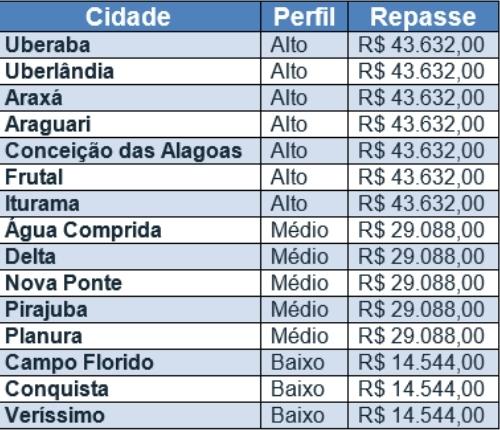 Para o repasse de recursos, os Municípios foram classificados em perfil baixo, médio e alto. Uberaba e Uberlândia foram consideradas cidades de perfil alto, tendo cada uma direito ao valor mais elevado do incentivo (R$43.632,00).