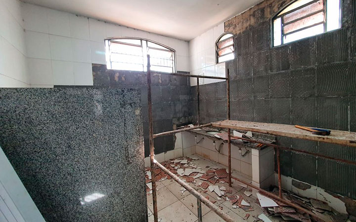 O banheiro feminino da parte inferior do Mercado Municipal começou a ser preparado para reforma nessa segunda-feira. A primeira intervenção interna da empresa Elis Construções, Terraplanagem e Transportes Ltda. seguirá programação, paralelamente à retirada dos paralelepípedos da área externa para implantação do canteiro de obras.