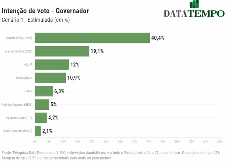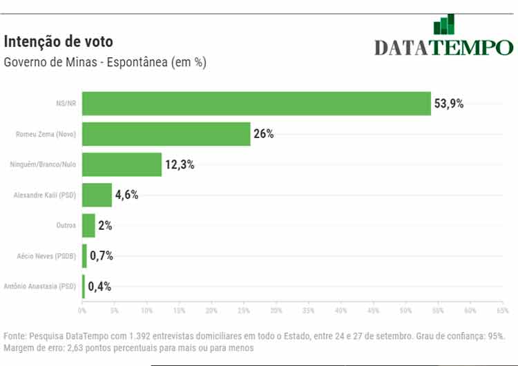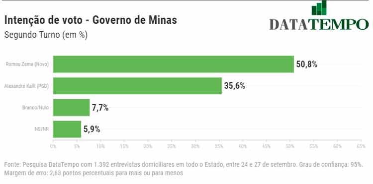 Governador Romeu Zema (Novo) permanece na liderança da disputa pelo governo de Minas Gerais. Os dados são de pesquisa realizada pelo DataTempo em todas as regiões do estado. O prefeito de Belo Horizonte, Alexandre Kalil (PSD), seu principal adversário, aparece em segundo lugar. Apesar de estar à frente com bastante folga (cerca do dobro da intenção de votos), Zema teve uma ligeira queda quando comparado com a pesquisa realizada pelo mesmo instituto em julho; já Kalil se manteve estável.