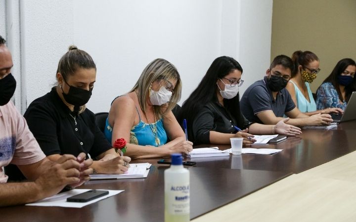 Representantes do Sindemu e do Governo Municipal, durante reunião de negociação ontem na Prefeitura/ Fotdivulgação