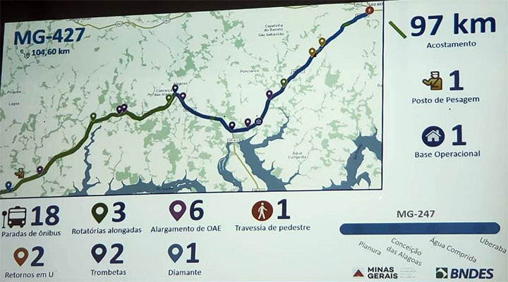 Já na LMG-798, que liga Uberaba a Nova Ponte, está prevista a construção de 81,5 quilômetros de acostamentos, duas rotatórias alongadas e dois retornos. Na BR-452, que sai de Araxá e passa por Uberaba e continua até Uberlândia, devem ser implantados 7,4 quilômetros de acostamento, nove rotatórias, quatro retornos e uma travessia de pedestre.