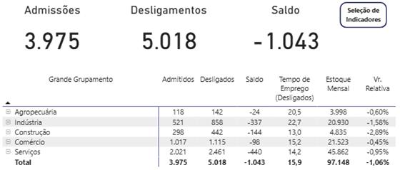 Estado. O cenário mineiro também foi de mais desligamentos, com 228.443 demissões e 155.688 contratações, resultando em saldo negativo de 72.755. Serviços, -28.392; Indústria, -17.016; Construção, -15.304, Agropecuária, -6.862, e Comércio, -5.181.