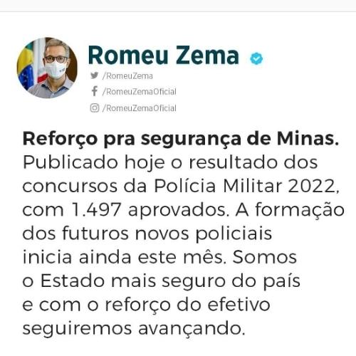 Conforme a postagem, o governador Zema afirma que "somos o Estado mais seguro do país e com o reforço do efetivo seguiremos avançando".
