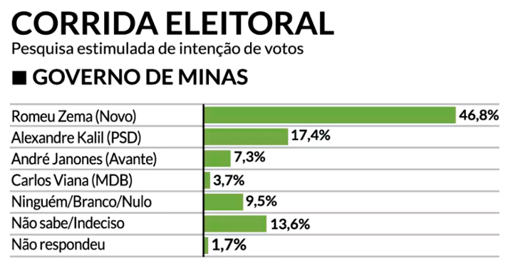 Dos que responderam aos questionamentos, 46,8% das intenções de votos são para Zema, contra 17,4% para Alexandre Kalil (PSD). O cenário pode sofrer alteração sobretudo com uma eventual aproximação entre Kalil e Lula, que poderia direcionar os votos dos indecisos. A favor de Zema, no entanto, pesa a força do interior, inclusive Uberaba.
