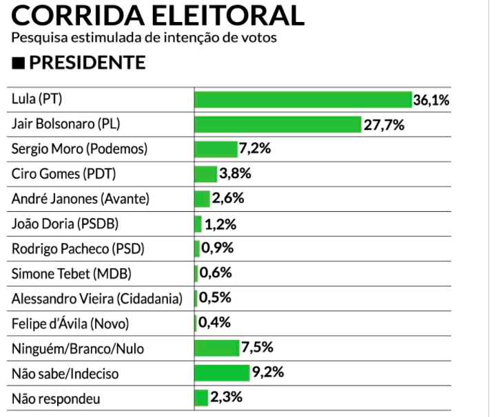 Para o governo federal, Lula soma 36,1% das intenções de voto, seguido por Jair Bolsonaro, com 27,7%.