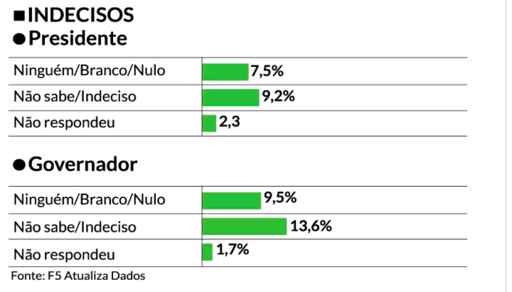 Os índices compõem o cenário estimulado, ou seja, quando os eleitores opinam com base em lista de potenciais candidatos mostrada pelos entrevistadores. Na sondagem espontânea, em que os entrevistados podem apontar nomes livremente, 49,4% dos eleitores mostraram indecisão no pleito para governador, sendo que outros 12,5% apontam a intenção de anular voto e 10,5% preferiram não responder.